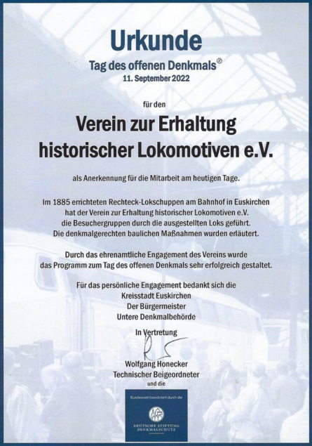 Anfang September fand wieder der Tag des offenen Denkmals, das jährliche Highlight unseres kleinen Eisenbahnvereins, statt. Viele Besucher, darunter auch viele Kinder, strömten in den Lokschuppen und konnten sich die Welt der Eisenbahn aus verschiedenen Blickwinkeln anschauen und auch anfassen. Wir haben uns über euer Kommen sehr gefreut!