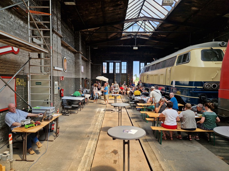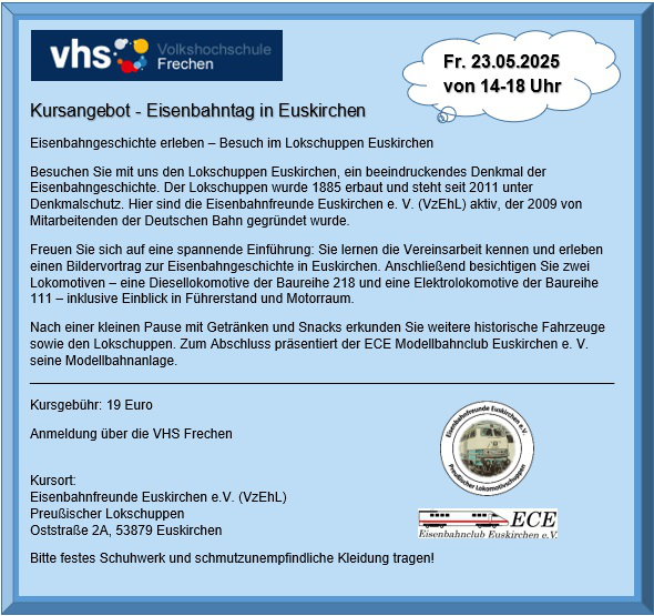 IIn Zusammenarbeit mit dem ECE Eisenbahnclub Euskirchen e.V. konnten wir in einem über vierstündigem Bildungsprogramm unseren Gästen ein ausführliches Programm zur Eisenbahngeschichte in der Region und zum historischen Lokschuppen bieten. Ebenso wurde den Teilnehmern u.a. die Diesellok Baureihe 218 sowie die Elektrolok Baureihe 111 mitsamt Ihrer Technik und Funktionsweise vorgestellt. Abgerundet wurde die Veranstaltung durch einen Besuch beim ECE und deren Demonstration ihrer Miniatur-Eisenbahnanlagen. Für das leibliche Wohl war stets gesorgt, sodass kein Besucher mit hungrigem Magen nach Hause fahren musste.