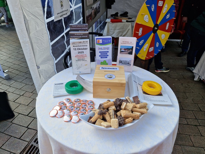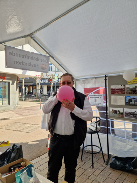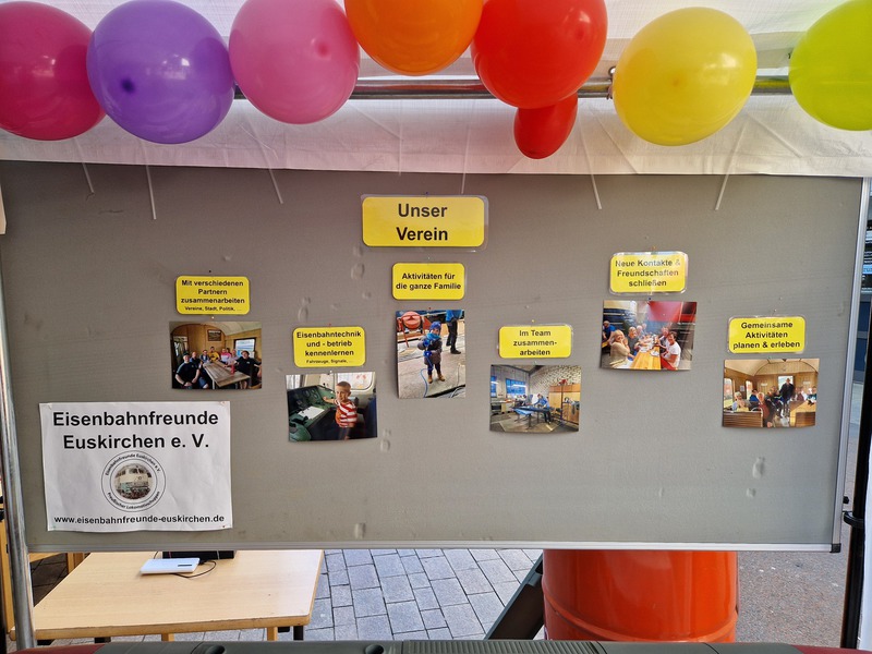 Auf dem diesjährigen Stadtfest in Euskirchen war auch unser Verein mit einem kleinen aber feinen Informationsstand vertreten. Zahlreiche Ausstellungsstücke und Fotos wurden ausgestellt und eine Fotobox mit originalen Eisenbahner-Utensilien konnte genutzt werden. Neben einem Glücksrad, einem heißen Draht und einer Menge Holzeisenbahn kamen auch unsere kleinen Besucher voll auf Ihre Kosten. Unser Lokschuppen war während des Stadtfestes ebenfalls geöffnet. Dort konnten Eisenbahninteressierte durch unsere Mitglieder eine kostenlose Rundführung erhalten.