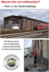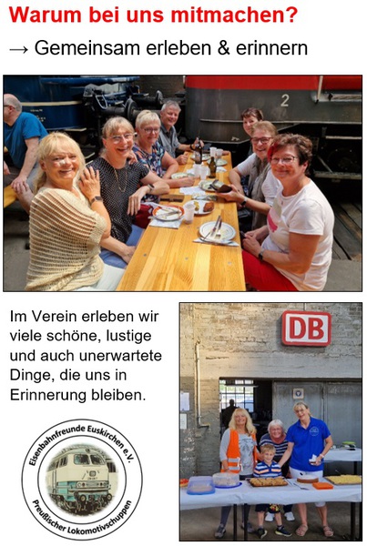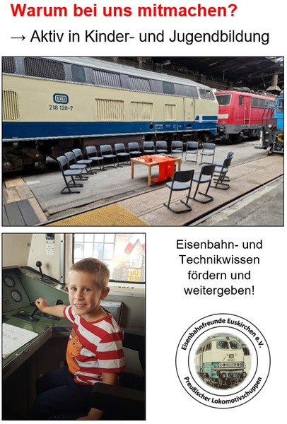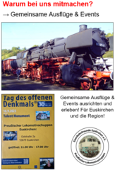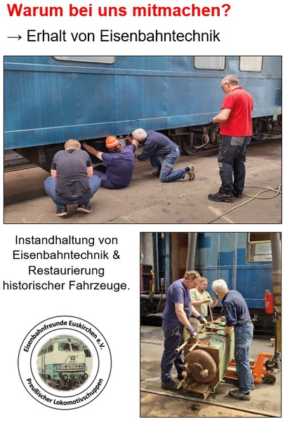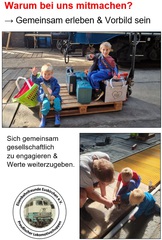 Sich ehrenamtlich in einem Verein und für die Gesellschaft zu engagieren ist immer etwas Gutes und was Jeden zufrieden und stolz machen soll. Bei uns ist es die Eisenbahn, die uns verbindet und uns hierher geführt hat. Eisenbahn ist aber nicht alles, wir freuen uns über jederlei Unterstützung.